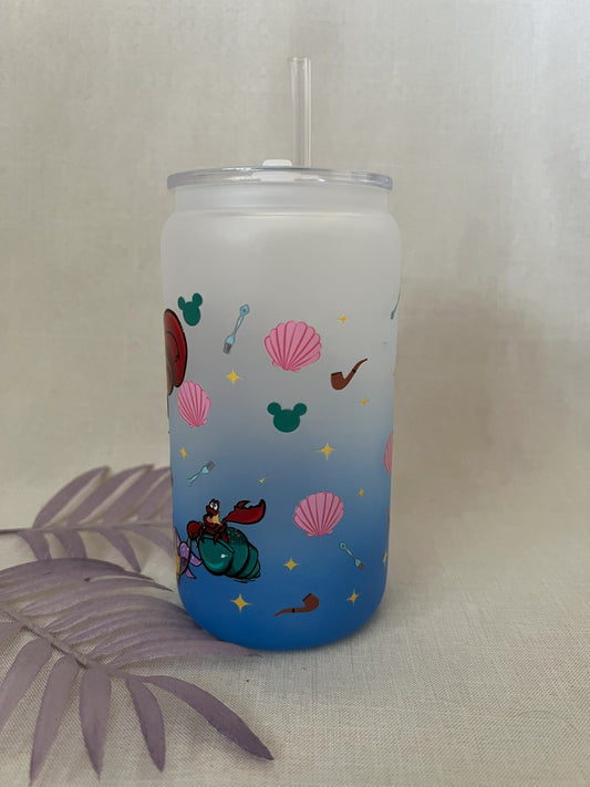 RTS - Red Hair Mermaid 16oz Blue Ombre Glass Cup with Plastic Lid & Straw