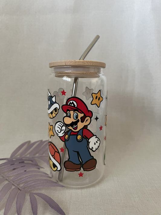 RTS - Mario 16oz Glass Cup with Bamboo Lid & Metal Straw - CLEARANCE