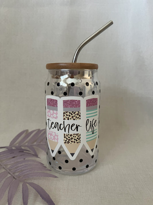 RTS - Teacher Life 16oz Glass Cup with Bamboo Lid & Metal Straw - CLEARANCE