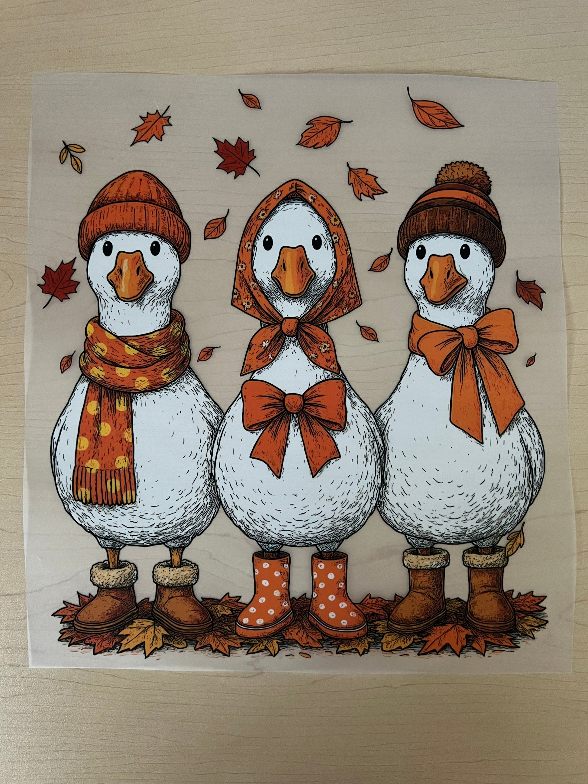 A completed short sleeve T-shirt, crewneck or hoodie with fall goose print pressed. Short sleeve T-shirt will be on Comfort Colors. Crewnecks and hoodies will be on Gildan.